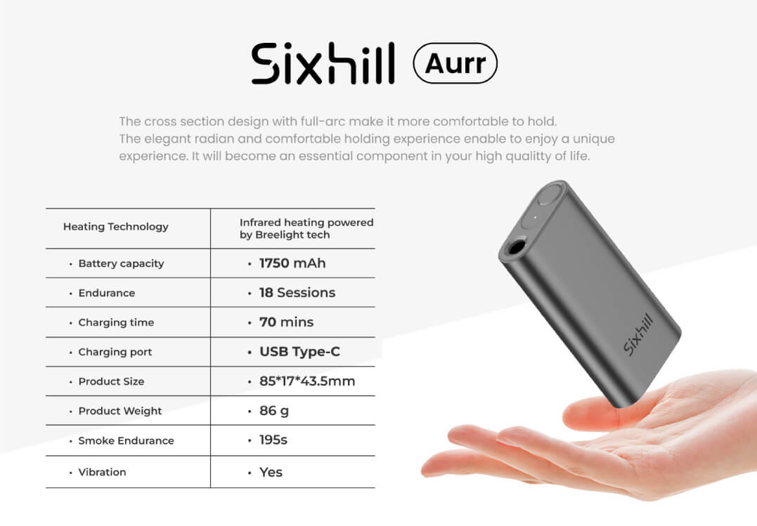 SIXHILL AURR mengadopsi teknologi Breelight dan teknologi pemanasan inframerah canggih yang diciptakan oleh Sixhill. Skema desain inovatif ini memiliki penetrasi panas yang tepat, memberikan pemanasan yang merata dan menghasilkan sensasi dan rasa yang lebih baik, menjadi inovasi utama dalam penggunaan tembakau. Fitur khas dan teknologi canggih produk ini dengan 2 mode :